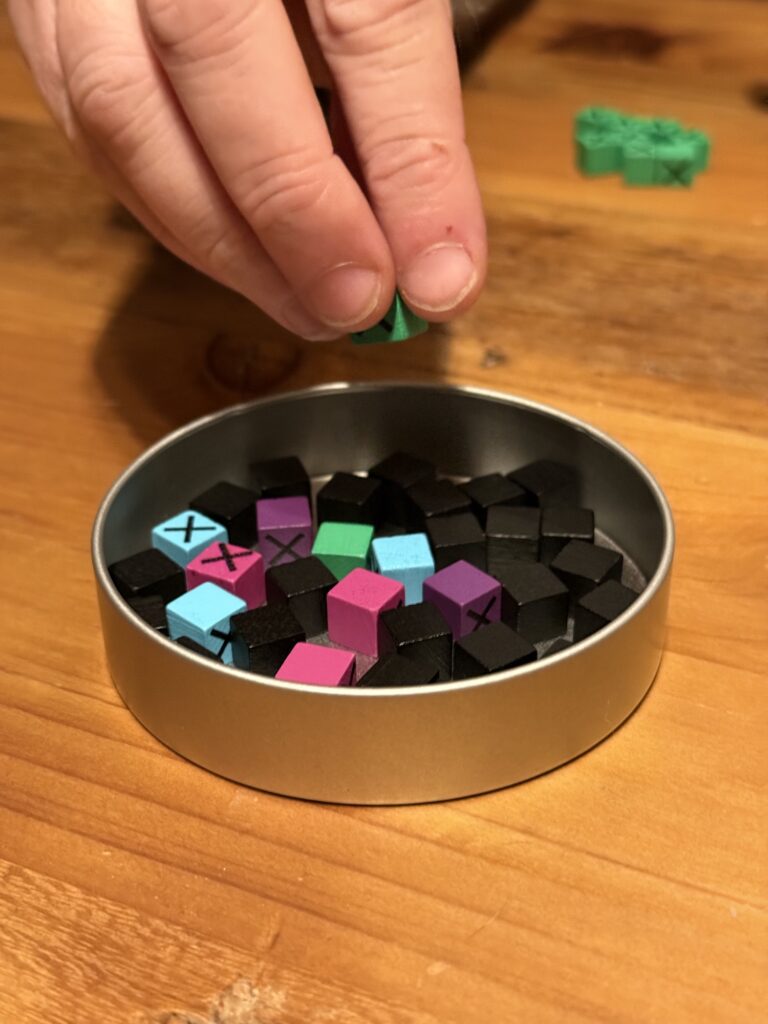 Le cube tombe bien à plat au fond de la boîte ? C’est au joueur suivant de lancer. Le cube est bien à plat, et en plus, une croix est visible sur le dessus ? Vous pouvez rejouer une fois. Mais si le cube n’a pas trouvé son spot, le joueur est éliminé. Le premier joueur à se débarrasser de tous ses cubes, ou le dernier n’ayant pas été éliminé, remporte la partie.