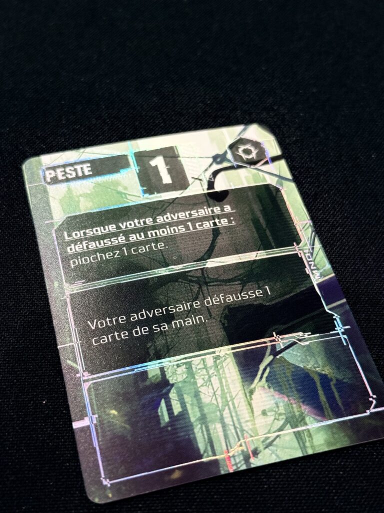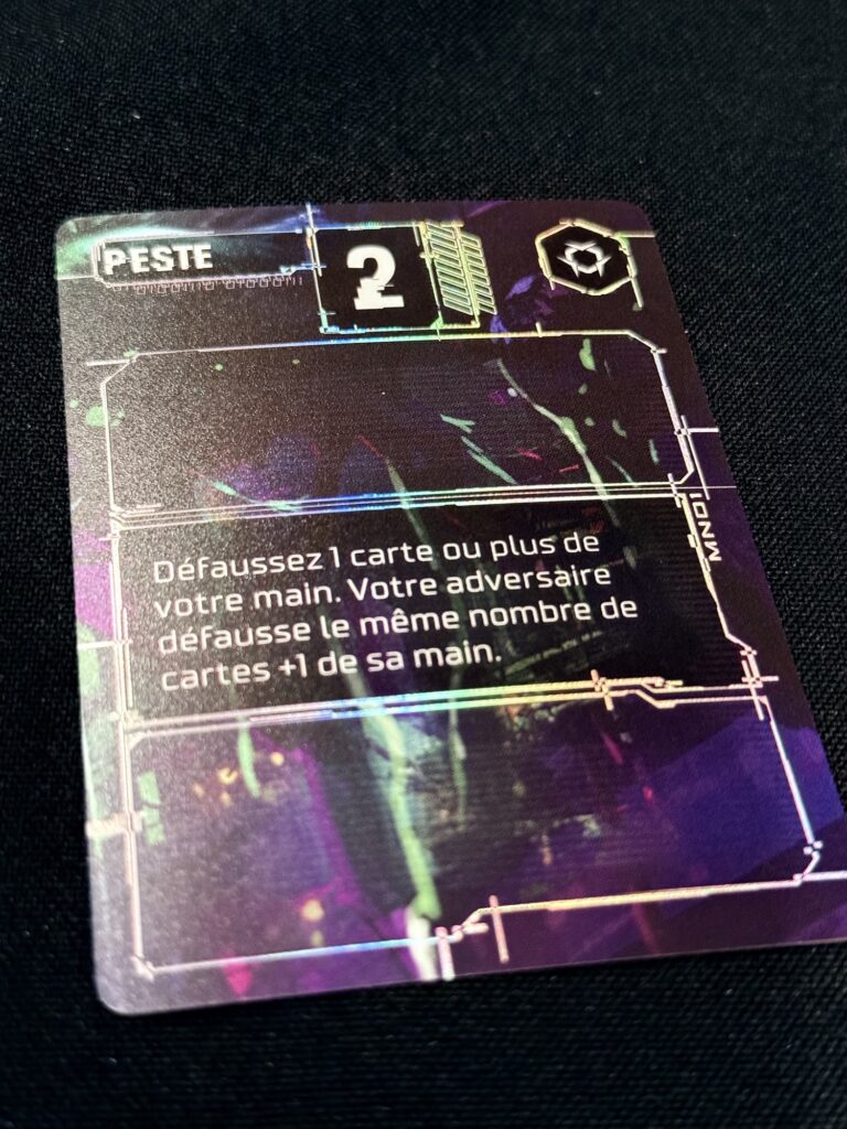 Chaque carte posée peut modifier l’équilibre d’un protocole, déclencher un effet inattendu ou ouvrir une opportunité pour l’adversaire. Très vite, la partie devient un jeu d’observation et d’anticipation. On surveille les lignes adverses, on essaie de deviner ce qui se prépare et on choisit soigneusement le moment où intervenir. Certaines cartes permettent d’accélérer un protocole vers sa compilation, d’autres viennent perturber le travail adverse, on peut piocher, défausser, retourner, déplacer, et encore plein de trucs en « er ».