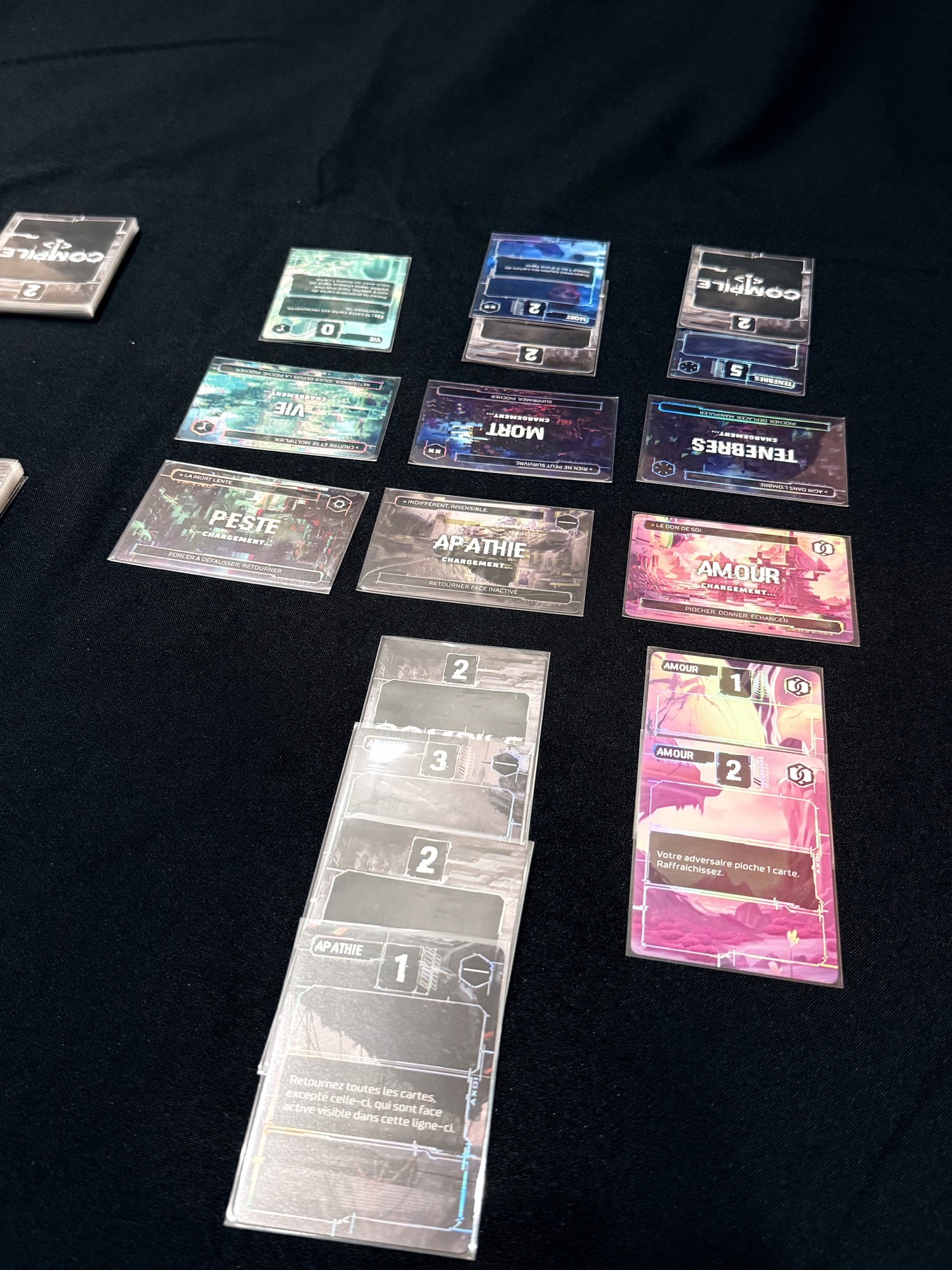 En cours de partie, les cartes s'empilent sous les protocoles de Compile
