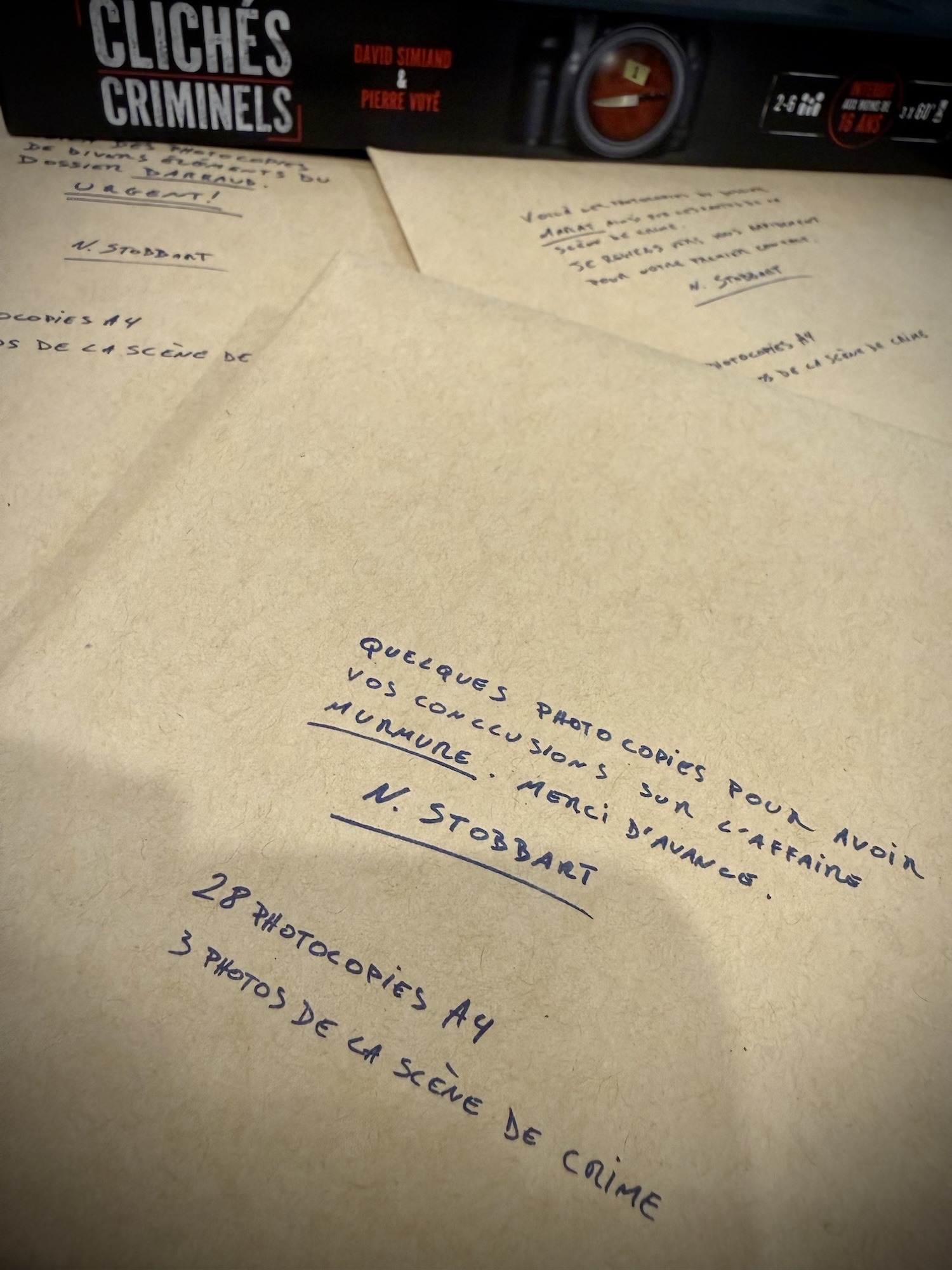 Clichés Criminels, c’est une boîte classique avec trois enveloppes scellées par un fil. C’est autant d’enquêtes qui vous attendent. Elles sont totalement indépendantes les unes des autres et (on va voir si vous avez suivi) pleines de photos.