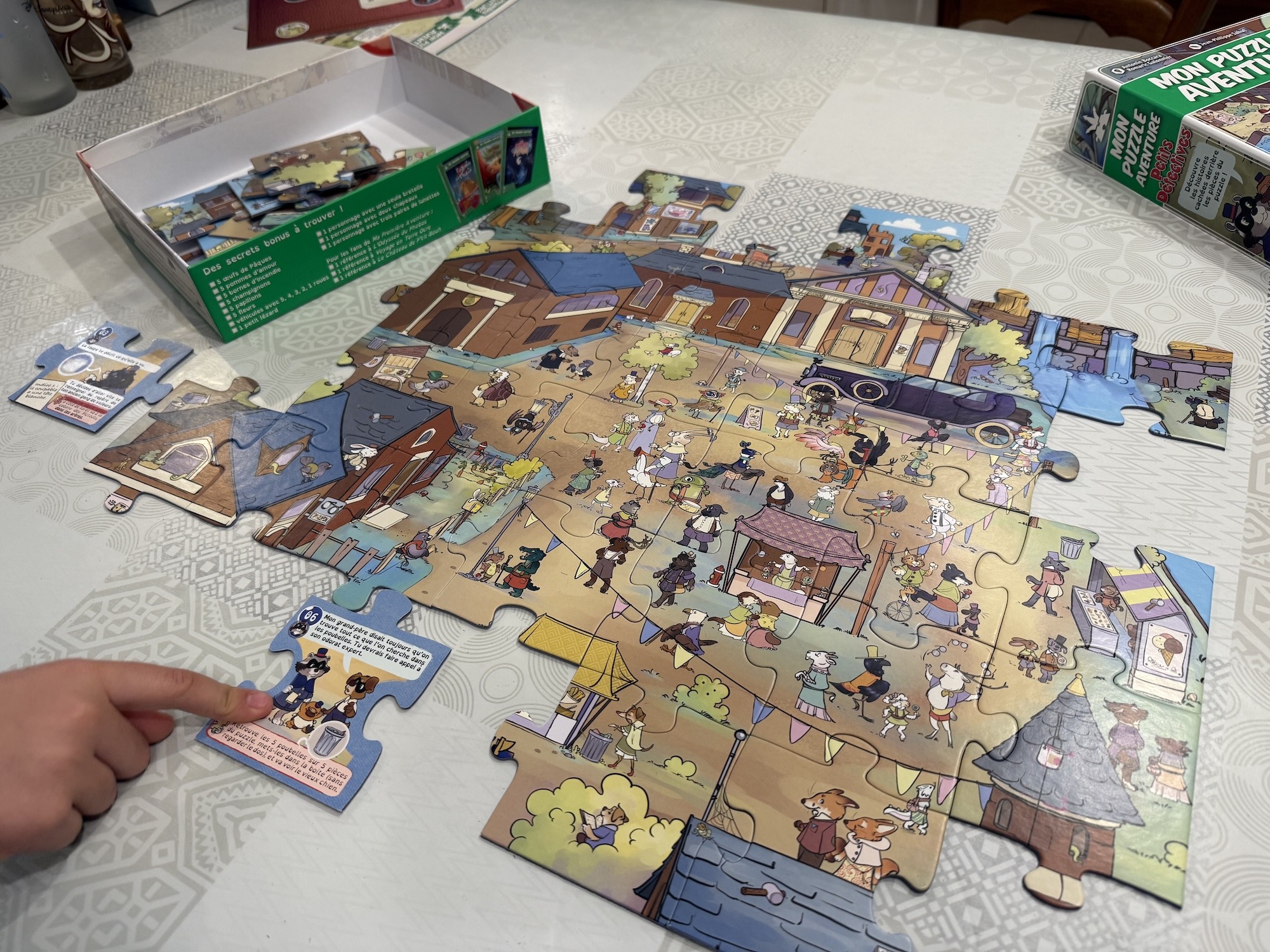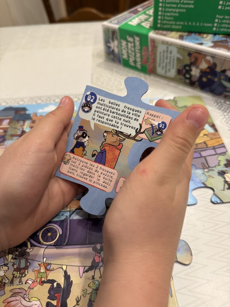Les jeux d’enquête pour enfants sont de plus en plus nombreux, mais rares sont ceux qui réussissent à combiner narration, observation et manipulation. Mon Puzzle Aventure : Petits Détectives tente justement ce mélange en proposant une expérience hybride entre puzzle et enquête, comme tous les autres puzzles de la même gamme déjà sortis. Avec mon fils de 10 ans, nous avons exploré les trois enquêtes contenues dans la boîte… même si, soyons honnêtes : il commence déjà à être un peu grand pour ce type de jeu.